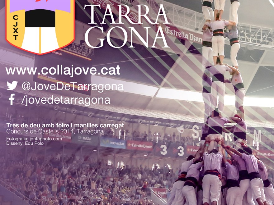 Aquest cop el protagonista era l’enorme i molt fotogènic tres de deu que la colla va assolir el passat Concurs de Castells, a la Plaça de Toros de Tarragona. Aquest cop hem optat per un disseny més net i lleugeret que el de l’anterior bus dissenyat, donant tot el protagonisme a la fotografia presa pel fotògraf Jon TC Photo i afegint-hi el lila corporatiu. Malgrat tot, imprimir sobre un bus té complicacions que no et trobes imprimint sobre paper, i en el procés de vinilatge l’empresa va haver de fer alguns canvis compositius al disseny no del tot consensuats. De tot se’n aprèn, diuen!