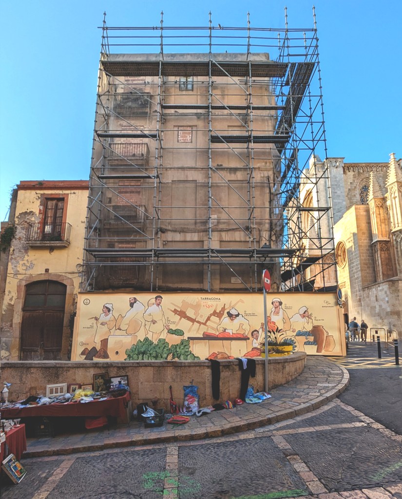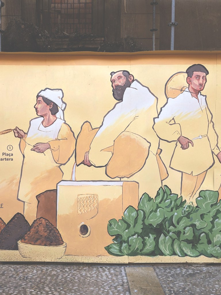 Mural de l’eix comercial de la Tarragona medieval comissionat per la Conselleria de Comerç de l’Ajuntament Tarragona. Plaça dels Cabrits, Part Alta, Tarragona.
